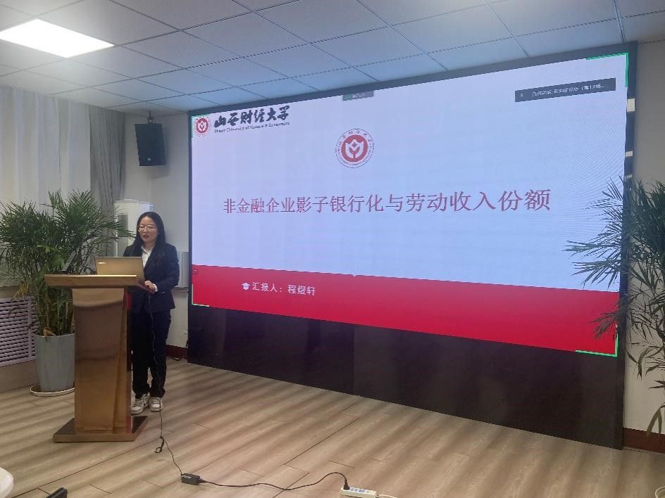 硕士生程煜轩汇报了工作论文《非金融企业影子银行化和劳动收入份额》,李颖和游竹君两位老师进行了点评。李颖老师指出文章在如下三方面存在有待完善之处:(1)文章如何才能有效提出问题,并展现文章的研究价值?(2)理论分析部分的基本逻辑是否清晰?是否存在自相矛盾之处?(3)调节效应是否应该围绕文章的核心问题提出?游竹君老师则认为:文章的摘要过于格式化;文章的表述口语化严重;创新点不明确;理论分析不条理;研究设计有待提升。