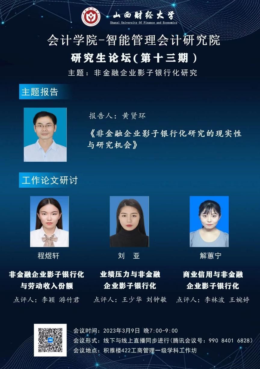 2023年3月9日晚7点到10点,由beat365唯一官方网站与智能管理会计研究院联合举办的研究生论坛(第十三期)以线下及线上两种形式同步举行。本次学术论坛的主题为“非金融企业影子银行化”。本期论坛的轮值主持人为黄贤环副教授。