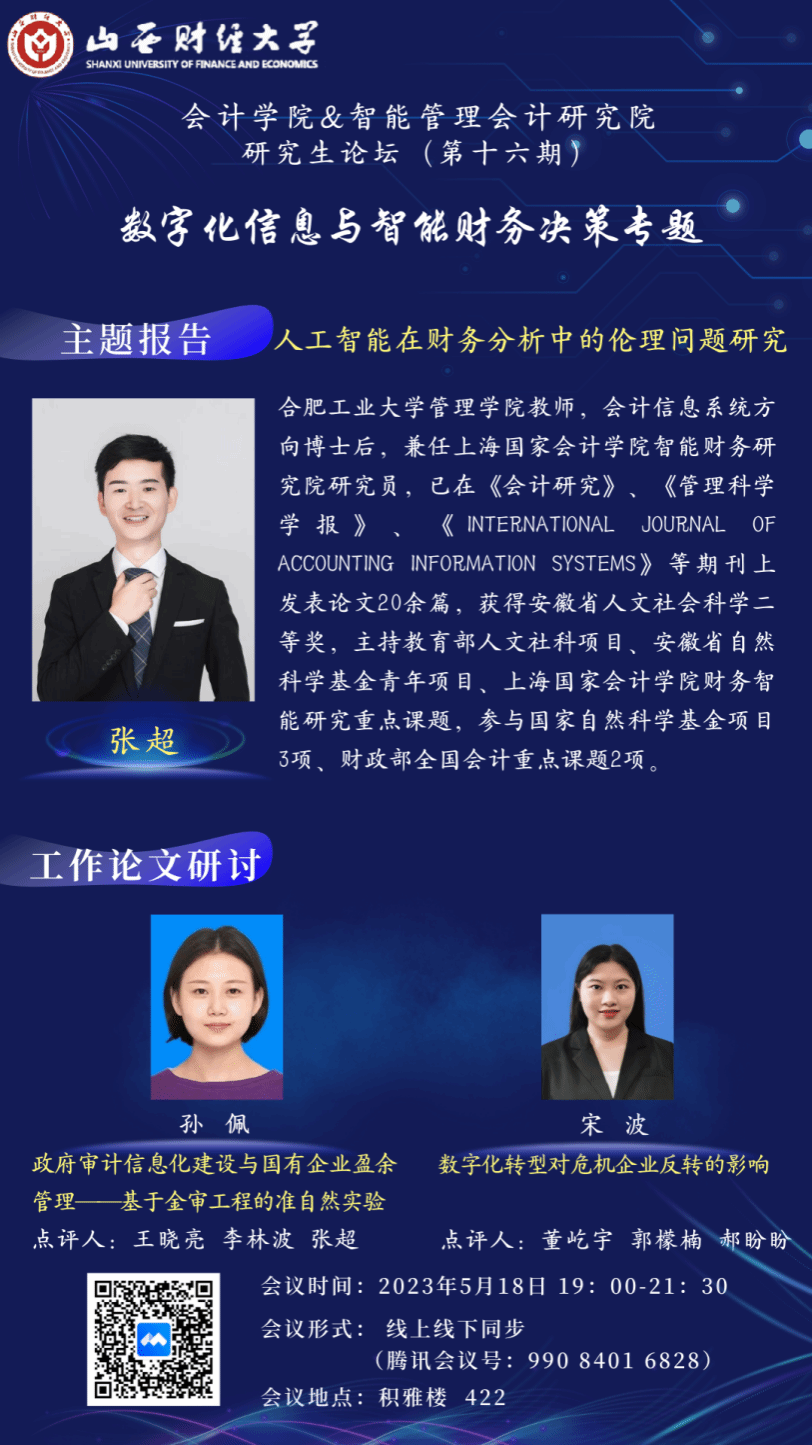 2023年5月18日晚7点至10点,由beat365唯一官方网站与智能管理会计研究院联合举办了研究生论坛(第十六期)。本次论坛的主题为“数字化信息与智能财务决策”,采取线下与线上同步的方式。轮值主持人为beat365唯一官方网站财务管理教研室主任郝盼盼副教授,论坛特别邀请合肥工业大学管理学院教师、上海国家beat365唯一官方网站智能财务研究院研究员张超博士后做讲座。