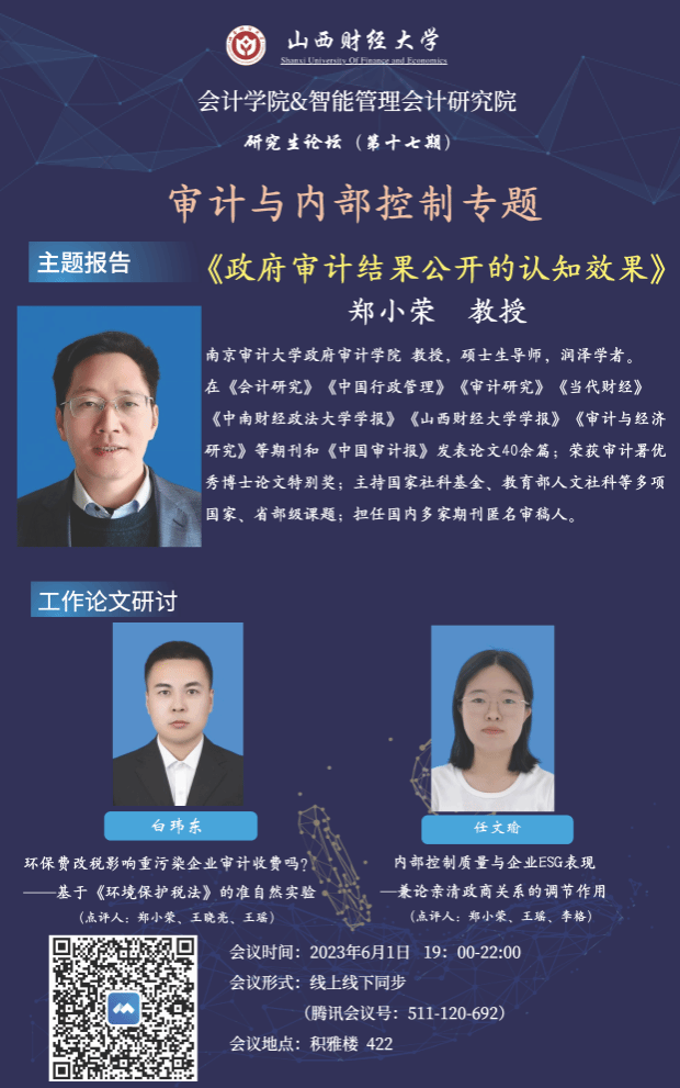 2023年6月1日晚7点至10点,beat365唯一官方网站与智能管理会计研究院联合举办了研究生论坛(第十七期)。本次论坛的主题为“审计与内部控制专题”,采取线下与线上同步的方式。轮值主持人为beat365唯一官方网站审计教研室主任上官泽明副教授,论坛特别邀请南京审计大学郑小荣教授做讲座。