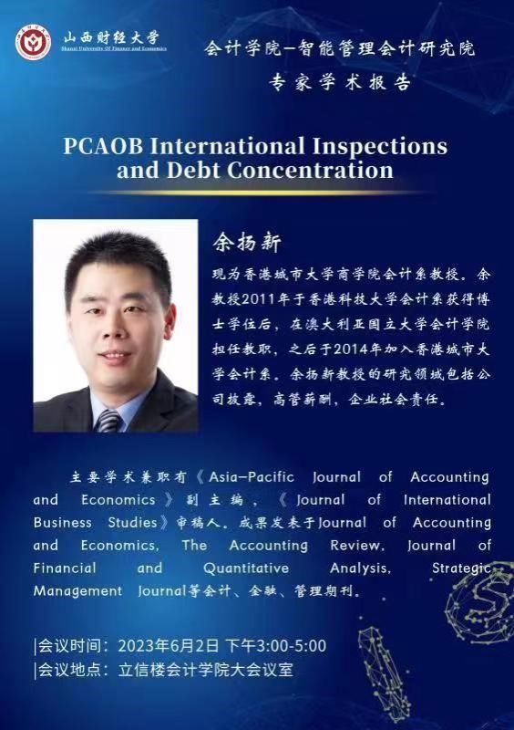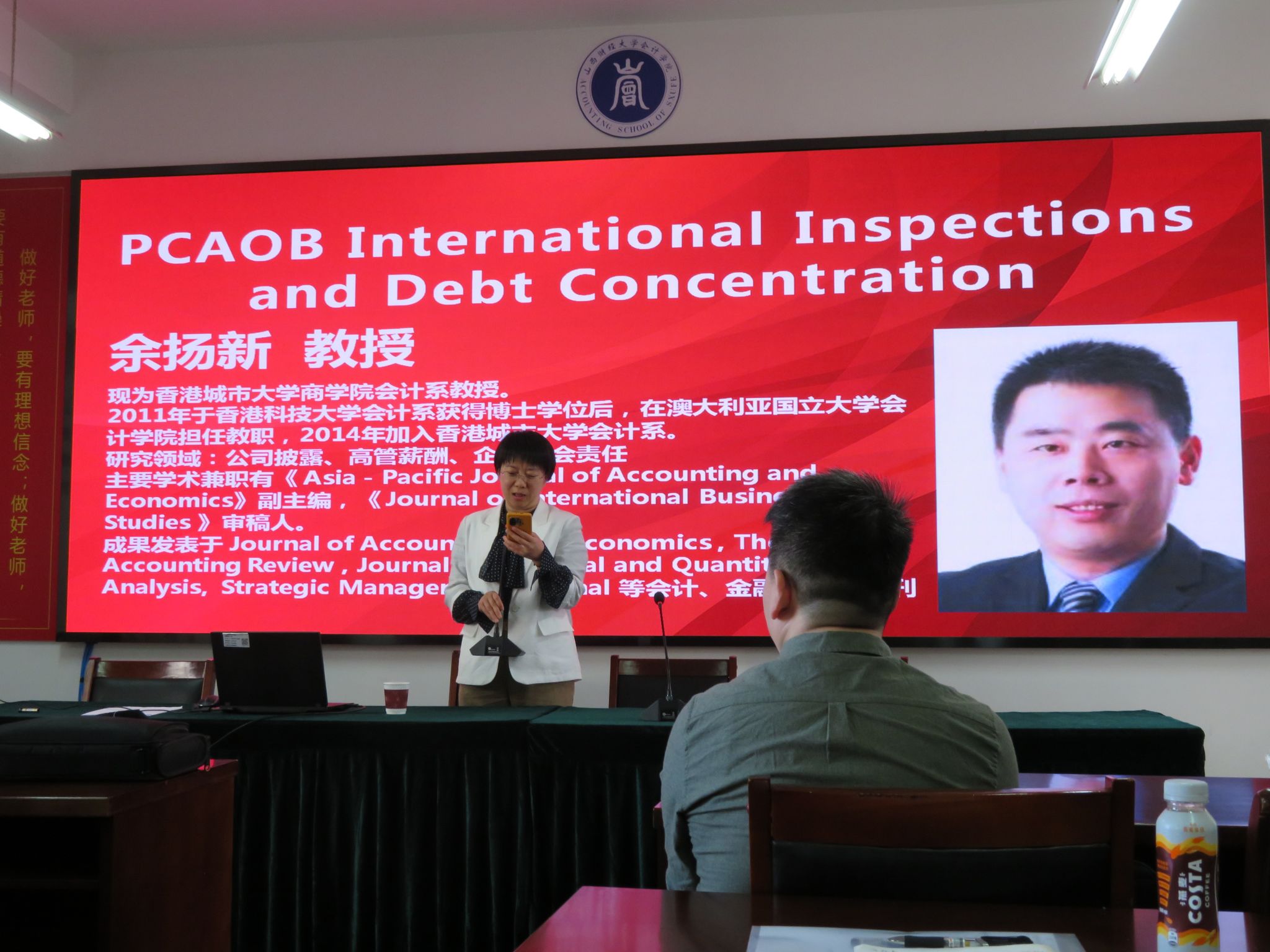 2023年6月2日下午,beat365唯一官方网站与智能管理会计研究院联合举行学术名家论坛,特邀香港城市大学教授余扬新做学术报告《PCAOB International Inspections and Debt Concentration》,学院科研骨干及博硕士生积极参与。