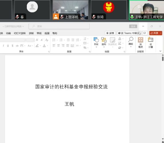 王帆教授做了题为《国家审计的社科基金申报经验交流》的主题讲座。首先,王帆教授以《区域碳排放转移的政策治理效应与跟踪审计协同研究》课题为例,介绍了课题的选题背景,并对选题依据、选题的科学性以及如何提出问题进行说明;其次详细说明了写国内外研究动态、研究述评、研究价值的注意事项;最后,王帆教授对课题的框架思路、研究方法、研究计划、研究成果、研究基础、参考文献等部分的撰写进行详细说明。