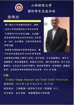5月16日上午澳门城市大学金融学院院长张伟光教授做题为《气候变化风险敞口和贸易信贷提供》的专题讲座。首先,张伟光教授的论文研究了气候变化敞口与贸易信贷供应之间的关联,并提出两个假设:气候变化风险敞口可以促使企业提供更多贸易信贷,或减少为客户提供的贸易信贷。其实证结果支持了第一个假设,即气候变化风险敞口可以促使企业提供更多的商业信贷,且对财务上更灵活、业绩不佳或声誉较差的公司影响更大。其次,张教授还列举了与该文研究相似或题目的文章,介绍了该文与以往研究在数据选取、变量测度设定、研究结论、研究背景等方面存在的差异。再次,张教授介绍了多种内生性问题的审查方法和灵敏度测试的方法。最后,张教授对文章做出总结,该文研究了企业的气候变化风险敞口如何影响其贸易信贷准备金,以及如何通过提供贸易信贷的动机来解释气候变化风险敞口的影响。强有力的证据表明,面临更大气候变化风险的公司更有可能向其客户提供贸易信贷。实证分析揭示了推动气候变化风险敞口与贸易信贷供应正相关关系的流动性、财务业绩和声誉损失等潜在机制。