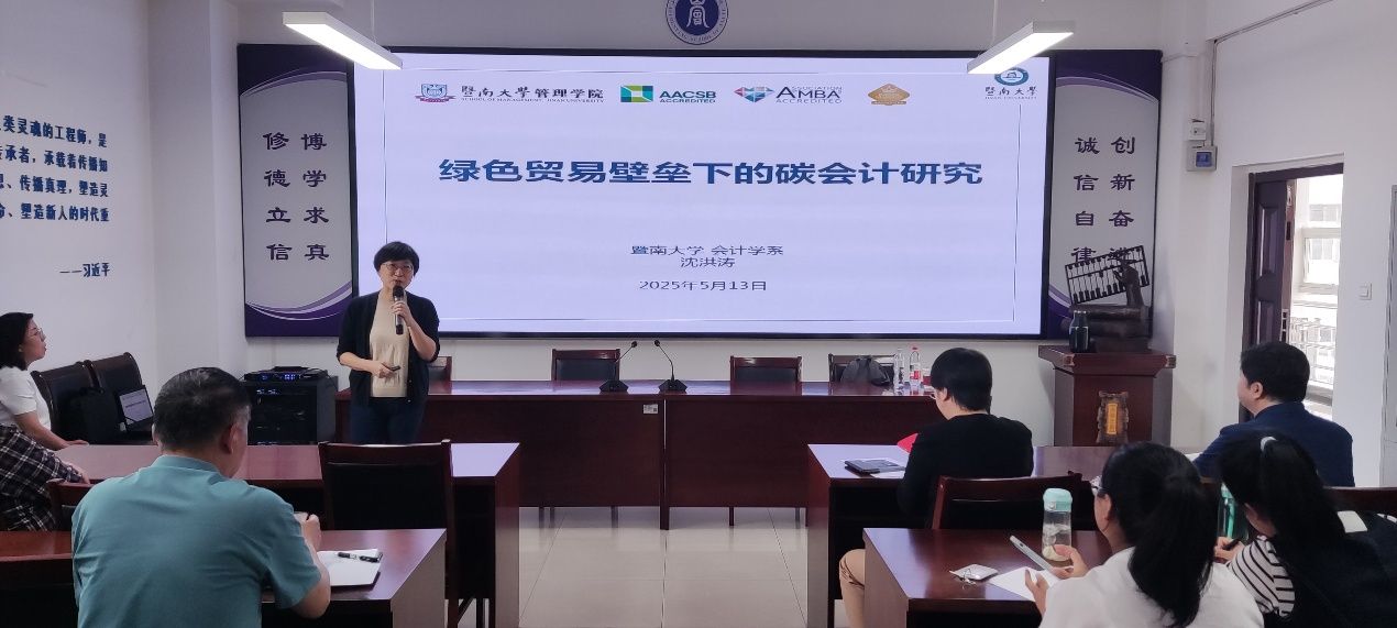 13日下午,沈教授以《绿色贸易壁垒下的碳会计研究》为题,为beat365唯一官方网站骨干教师及博、硕士研究生做专题报告,先后讲解了“绿色贸易壁垒的背景”、“碳成本核算”、“产品碳足迹核算”、“搁浅资产”四方面的内容。报告围绕全球绿色贸易新格局下的会计学科发展,从理论前沿与实践应用双重维度展开深度剖析。沈教授首先解读了欧盟碳边境调节机制(CBAM)等国际贸易新规对中国企业的深远影响,继而系统阐释了碳成本核算体系、产品全生命周期碳足迹、搁浅资产等关键议题。并通过航运业典型案例分析,生动展现了碳会计在企业战略决策中的实践价值。