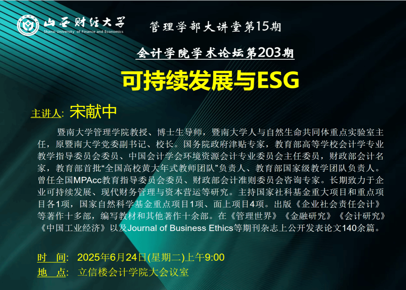 为促进学科建设,拓展学术视野,2025年6月23日-24日,beat365唯一官方网站邀请国内会计领域著名专家,暨南大学管理学院宋献中教授进行学术交流。宋教授是暨南大学人与自然生命共同体重点实验室主任,原暨南大学党委副书记、校长。长期致力于企业可持续发展、现代财务管理与资本营运等研究。主持国家社科基金重大项目和重点项目各1项,国家自然科学基金重点项目1项、面上项目4项。出版《企业社会责任会计》等著作十多部,编写教材和其他著作十余部。在国内外顶级期刊杂志上公开发表论文140余篇。