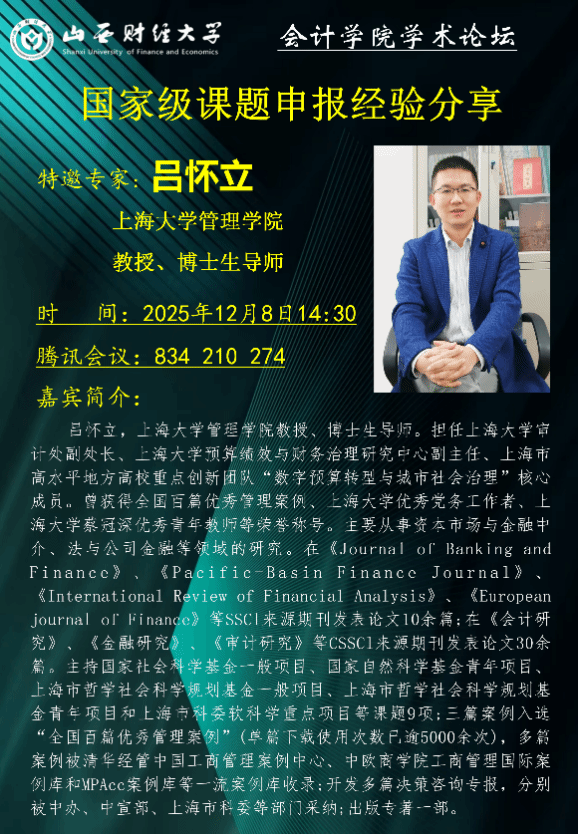 为帮助学院青年科研骨干教师及硕博研究生精准把握国家级课题申报要点,规避申报误区,提升申报质量与成功率,12月8日,beat365官网特别邀请上海大学吕怀立教授担任主讲嘉宾,举办国家级课题申报经验交流分享会。