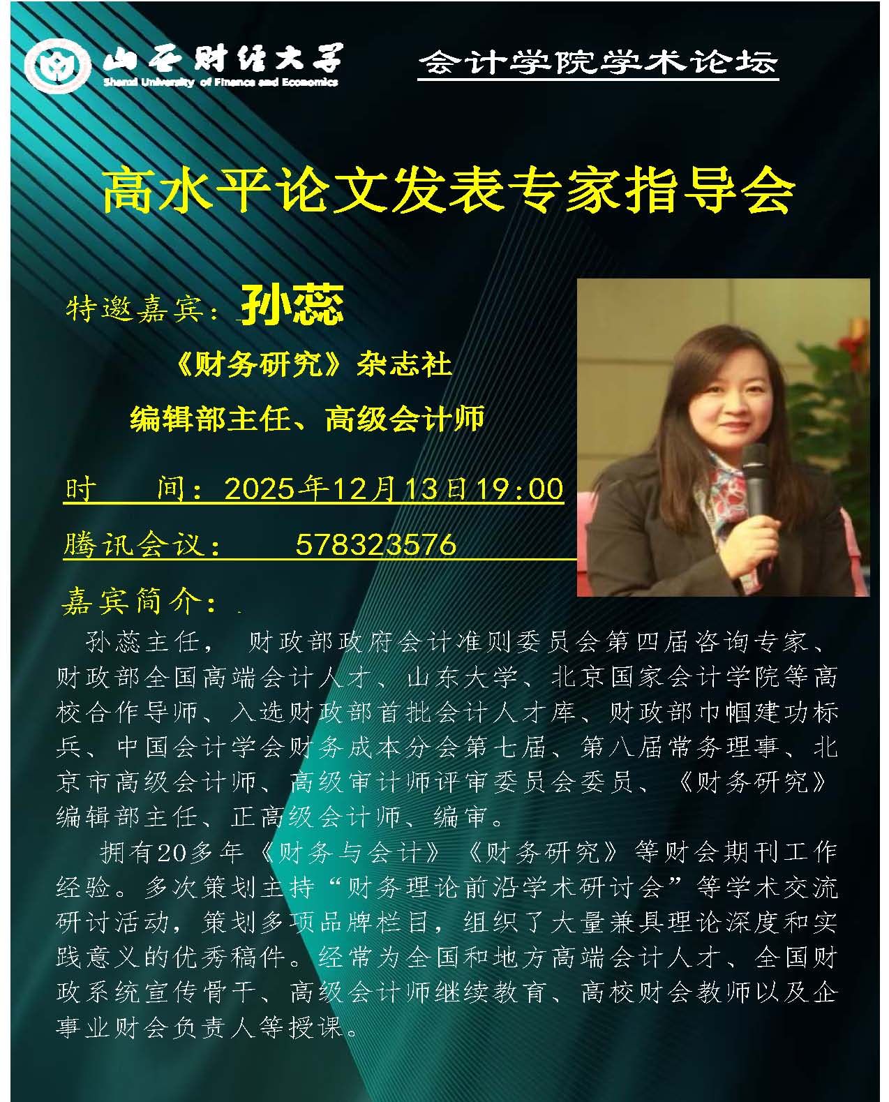 2025年12月13日晚19:00,beat365唯一官方网站学术论坛第216期在线上如期举行。本期论坛特邀《财务研究》编辑部孙蕊主任担任主讲嘉宾,为学院师生带来一场题为“高水平论文发表专家指导会”的学术报告。论坛由beat365官网王晓亮教授主持,学院青年科研骨干教师及硕博研究生共计50余人齐聚一堂,围绕这一主题展开了深入的学习与交流。
