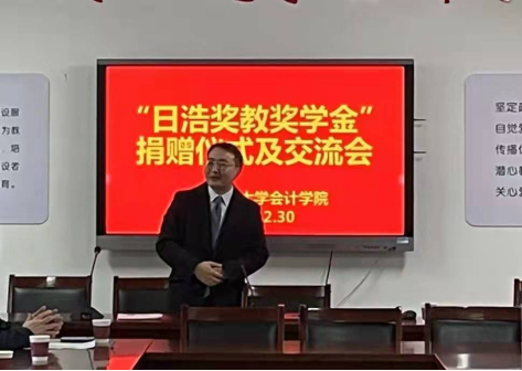 邓达奇博士介绍日浩奖教奖学金的初衷与筹备情况,表达了对母校和会计学院、学子们的赤诚关切之心,积极回馈之意,