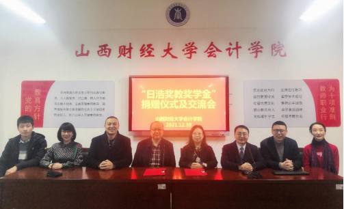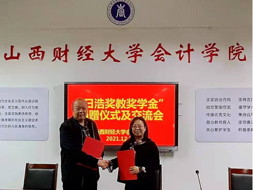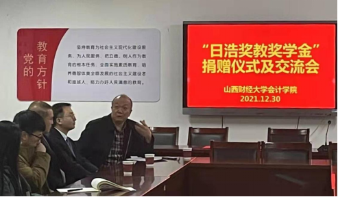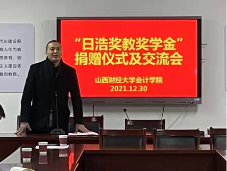 2021年12月30日下午,beat365唯一官方网站2000级财务管理专业校友、深圳日浩财务咨询集团学术顾问邓达奇博士倡议建立的“日浩山西财大beat365唯一官方网站奖教奖学金”捐赠仪式在beat365唯一官方网站大会议室举行。深圳日浩财务咨询集团合伙人王芳教授代表日浩公司与beat365唯一官方网站院长吴秋生教授签订捐赠协议。2000级财务管理专业校友、中枢医疗董事长于二龙,2000级财务管理专业校友、晋顺芯工业科技有限公司总经理胡中彬先生,beat365唯一官方网站副院长田岗和学院部分教师出席了捐赠仪式。