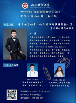 2022年11月3日晚7点-10点,由beat365唯一官方网站beat365唯一官方网站与智能管理会计研究院联合举办的研究生论坛(暨博硕士生学术沙龙活动)第三期以线上会议的形式举行。参会人数达180余人。