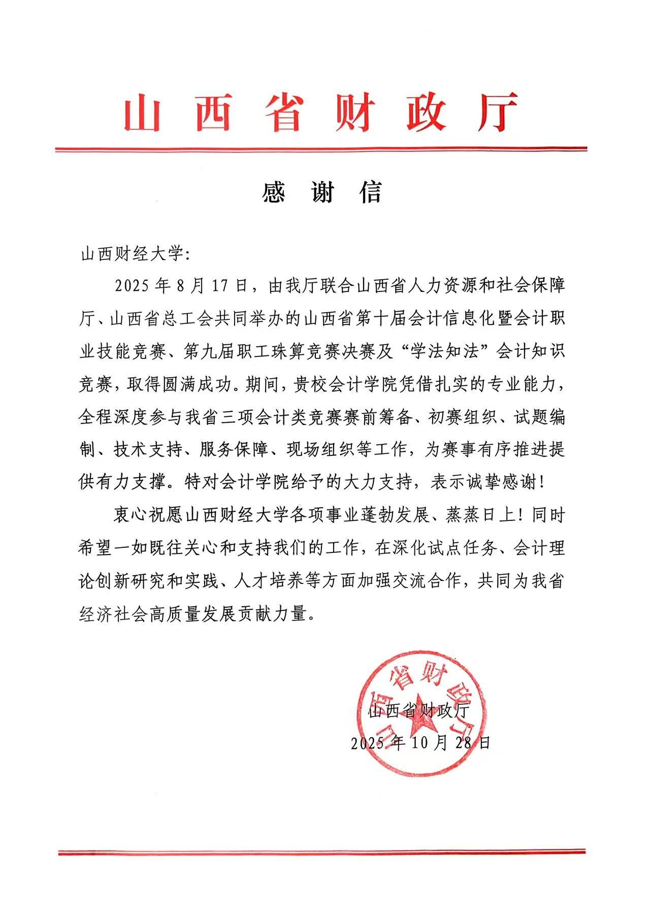 山西省财政厅致信致谢beat365官网鼎力支持三项会计赛事