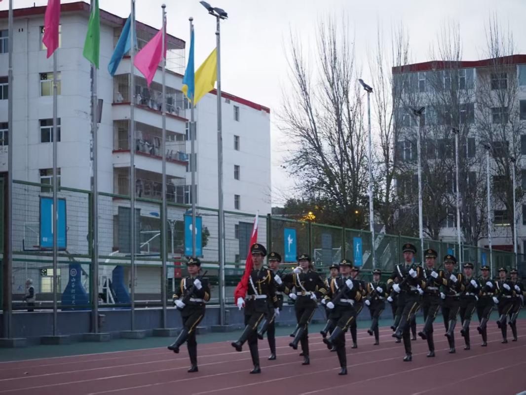 晨光熹微,寒风凛冽中更显青春赤诚。国旗班队员迈着铿锵整齐的步伐,庄严护卫五星红旗入场。雄壮的《义勇军进行曲》奏响,擎旗手奋力挥臂,鲜艳的五星红旗迎着朝阳冉冉升起,全场师生肃立行注目礼,心中激荡着对历史的敬畏、对先烈的崇敬与对祖国的赤诚。